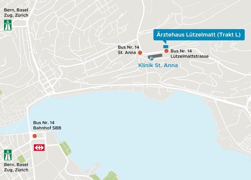 Auto: Parken Sie im Parkhaus der Klinik St. Anna. Am Ende des Parkauses ist rechts eine rote Türe ab dann folgen Sie der Beschreibung «Durchgang zum Aerztehaus Lützelmatt». Wir befinden uns im ersten Backsteinhaus im 4. Stock.